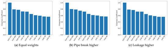 Figure 7 illustrates the results for each alternative TOPSIS application, highlighting how the ranking of critical pipes changes under different weighting schemes. This analysis provides insight into how the variation in the relative importance of the scenarios affects the prioritization of maintenance actions.