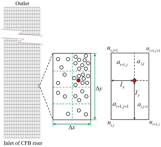 The two-dimensional CFB riser used in the present simulation is shown in Figure 1. The height and width of the riser are 9 and 100 cm, respectively. It is divided into a network of computational cells in the size of Δx × Δy = 0.45 × 0.9 cm, with a total cell number of 2220. The calculation of drag force acting on a particle should be determined according to its local gas velocity, so it is necessary to couple the gas velocity in the Euler coordinate with the Lagrange coordinate of the particle. Here, the area-weighted average method as shown in Equation (19) is used to determine the local gas velocity of a given particle k (red dot) according to the grid node parameters of the computation cell as shown in Figure 1.