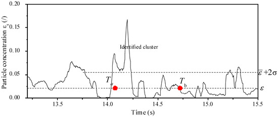 Soong et al. [27] first proposed the following three guidelines for the identification of clusters: (1) The particle concentration in a cluster must be significantly above the time-averaged particle concentration at the given local position and the operating condition. (2) This perturbation in the particle concentration due to clusters must be greater than the random background fluctuations of the particle concentration. (3) This concentration perturbation should be sensed for sampling volume with characteristic length scales greater than one to two orders of the particle diameter. Being consistent with these guidelines, Sharma et al. [20] imposed a criterion as illustrated in Figure 2. They proposed that the local transient particle concentration for a cluster must be greater than the time-averaged concentration by at least two times the standard deviation . They thought that the starting time of cluster Ta is the last time when its particle concentration exceeds before satisfying the limit, and the ending time Tb is the first time when its particle concentration falls below after falling below the limit. Obviously, Sharma’s criterion can only identify the appearing period of the cluster at a local position. In this study, since a descending cluster must pass through some successive cells along the wall before it vanishes or is re-entrained into the core of the CFB riser, the following method is developed to track the complete descending process of the cluster. Firstly, the cluster appearing periods in each cell at the wall are identified by Sharma’s criterion. Secondly, the successive cells at the wall that satisfy that cluster appearing periods from up to down and are continuous in time are found out. Any group of such successive cells is considered as a complete cluster descending path, which is verified by checking the snapshots of particles. By this method, the size of the computation cell should be comparable to the size of the cluster to gain a high cluster recognition accuracy. Rhodes et al. [13] reported that a typical cluster at the wall of the CFB riser has a characteristic dimension of about 1 cm. So, in the present simulation, the cell size of 0.45 × 0.9 cm is used, and the descending clusters can be successfully tracked. The number-averaged particle velocity, drag force, and concentration in each computational cell in which a descending cluster passes through are considered as its transient values.