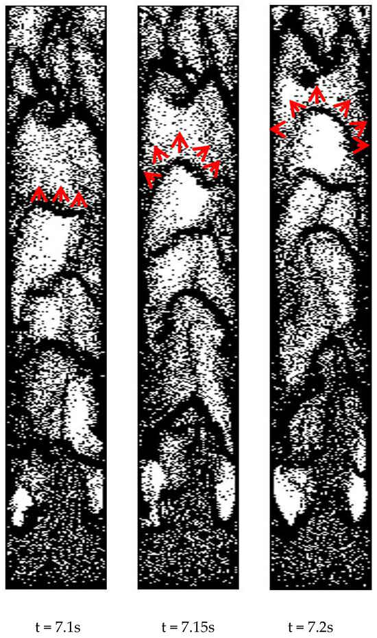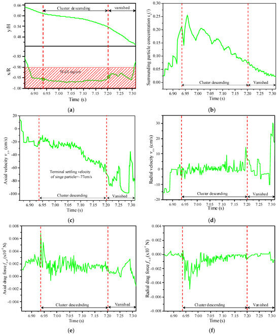 Comparing Figure 5e,f, it can be seen that during cluster descent, the magnitude of radial drag acting on this particle is comparable with its axial drag force. Especially in the initial descending stage, it is obviously pushed toward the wall under a larger radial drag force. In addition, the axial and radial forces acting on this particle as the cluster descends fluctuate with high frequency and low magnitude like its velocity. Once the cluster vanishes, the same drag force acting on this particle can result in a much larger variation in the particle’s velocity.