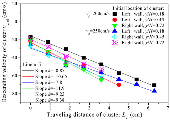 Up to now, the greatest number of measurements on clusters at the wall of the CFB riser has been of the descending velocity. The results showed that cluster descending velocity always lies in the range of 0.3~2 m/s irrespective of the experimental conditions [17]. Harris et al. [19] plotted cluster descending velocity reported by different investigators against the Reynolds number, Archimedes number, and dimensionless gas–solid flow ratio but obtained no clear correlation. A similar result is obtained in the present simulation. Because the entire descending process of a cluster can be tracked in the present simulation, we try to correlate a cluster’s descending velocity with its traveling distance. Figure 6 shows the descending velocities of several typical clusters as a function of their traveling distances at fluidization velocities of 200 cm/s and 250 cm/s. Clusters at the wall are accelerated, and a cluster’s descending velocity increases as it travels longer along the wall. Interestingly, the transient descending velocity of any cluster seems to be in a roughly linear relationship with its traveling distance, no matter what the location and the fluidization velocity are. Based on this, Equation (21) can be obtained.