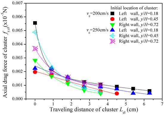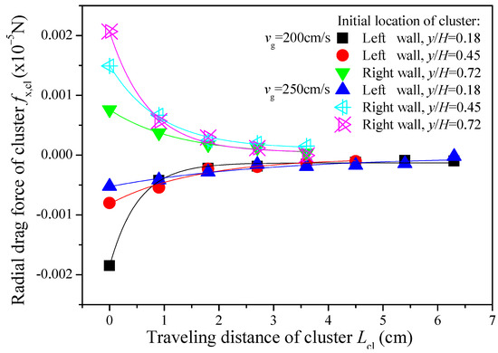 The axial drag force of a descending cluster as a function of the traveling distance is shown in Figure 7. The axial drag force acting on any cluster decreases fast in the initial descending stage and then decreases slowly in a longer following stage. It is known that the axial drag force acting on a descending cluster with a fixed particle arrangement during the accelerated descending process should keep increasing all the time because the relative velocity between cluster and gas increases with the descending velocity. However, the simulated result shown in Figure 7 indicates that the axial drag force acting on a descending cluster keeps decreasing along the traveling distance. Moreover, no matter how large the initial axial drag force is, it can quickly decrease to a closer value with other clusters in the initial descending stage. This indicates that descending clusters have an efficient and similar drag-reducing manner for overcoming the gas resistance in this stage. We think there are two possible ways. The first one can be found from the radial drag force of the cluster as a function of traveling distance as shown in Figure 8. In the initial descending stage, all clusters are subject to the obvious radial drag forces in the direction perpendicular to the wall which they fall along. This indicates that the descending clusters are integrally pushed to the wall in this stage. The particle snapshots shown in Figure 4 verify this behavior. In addition, Guo et al. [10] used a new image processing method based on a high-speed camera to identify, locate, and track clusters. Their image also showed that a descending cluster in the near-wall region moves fast toward the wall in the initial stage. On the one hand, under the effect of the gas velocity gradient in the near-wall region, a descending cluster should tend to be stretched into a streamline shape of flow resistance. On the other hand, the gas velocity decreases as the distance to the wall decreases. Therefore, the first possible way for drag reduction of the descending cluster should be shape-changing to reduce flow resistance. The second way for drag reduction of the descending cluster can be found from the cluster particle concentration as a function of traveling distance as shown in Figure 9. In the initial descending stage, the particle concentrations of all clusters quickly decrease into a narrow range. In particular, the higher the initial particle concentration of the cluster is, the faster it decreases. We know that in theory, under the same Reynolds number, decreasing particle concentration (increasing the mean distance between particles within the cluster) will result in an increase in the fraction of the gas flowing through the cluster, so the resultant drag force acting on the cluster would decrease. In fact, the effects of shape-changing and particle concentration decreasing on the drag reduction of the descending cluster are complicated fluid dynamics problems. The simulated result indicates that they both take action, and we believe the shape-changing should be dominant in the initial descending stage, but it should be further verified.
