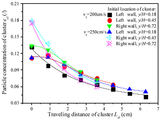 Meanwhile, it can be seen from Figure 9 that the initial particle concentrations of the descending clusters have a correlation with the descending location and fluidization velocity. Although the initial particle concentrations of clusters are different, they can decrease fast to a similar decreasing stage. The reason why this can be realized should be the mobility of the particle composing the cluster, which gives the descending clusters the ability to vary particle distance as well as shape continuously. Therefore, no matter what the initial particle concentration of a cluster is, during descent, it can soon self-regulate based on the routine of overcoming gas resistance (i.e., drag-reducing) and then take on a similar descending law like other clusters. This should be the reason why the operation parameters of the CFB have no obvious effects on the descending velocities of clusters [17].