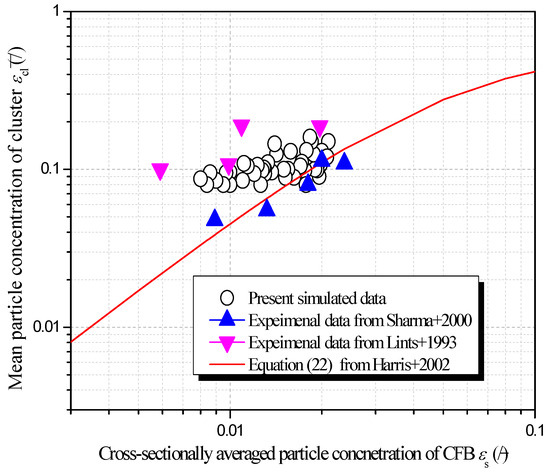 Because it is known from the present simulation results that the particle concentration of a cluster keeps decreasing during descent, here, the mean particle concentration of a descending cluster is calculated by averaging the transient value along its traveling distance. The mean cluster particle concentrations against the cross-sectionally averaged particle concentrations for all operation conditions are shown in Figure 10. The mean particle concentrations of the descending clusters obtained in the present simulation lie in the range of 0.07~0.2, and they are close to but deviate slightly from the value predicted by Equation (22). In particular, the increasing trend of the mean cluster particle concentration with the cross-sectionally averaged particle concentration of the CFB riser predicted by Equation (22) is not obvious in the present simulation. The possible reason is that the reported experimental data are usually not the average values along the cluster traveling distance. The experimental data from different investigators used to establish Equation (22) deviate greatly. For example, the simulated data agree well with the experimental data from Lints and Glicksman [31] but deviate from those from Sharma et al. [20]. Even so, the present simulated result is reasonable.