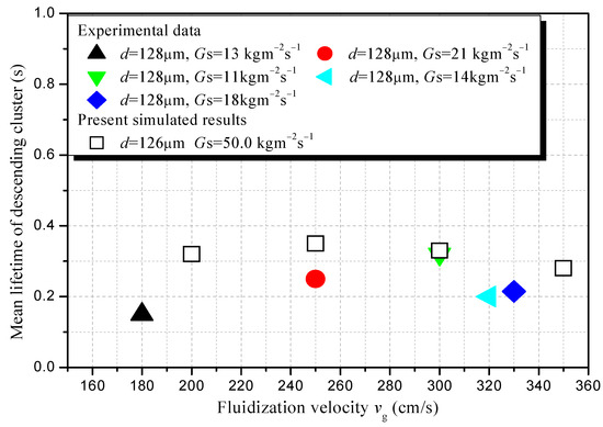 Figure 11 shows the mean cluster lifetimes of the descending clusters at different fluidization velocities obtained in the present simulation and the experiment by Noymer and Glicksman [32]. In the present simulation, the lifetime of the cluster is defined as the time period of the entire cluster descent process. The mean lifetime of clusters at any fluidization velocity is obtained by averaging the lifetimes of all tracked clusters. The simulated results show that the mean lifetime of the descending clusters is very short and lies in a narrow range of 0.25~0.4 s at any fluidization velocity, although a slight decrease with fluidization velocity increasing can be observed. The experimentally measured mean lifetime of descending clusters by Noymer and Glicksman [32] is a little shorter and shows a slight increase and then decrease with the fluidization velocity. Even so, these authors still concluded that the fluidization velocity has little influence on the lifetime of the cluster.