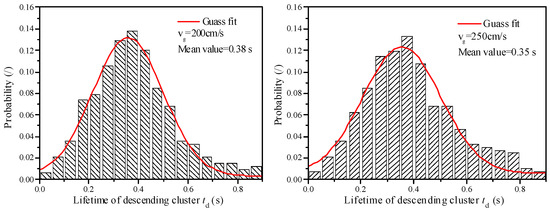 Although the mean lifetime of the descending cluster is very short and close, the lifetime distribution is actually wide, as shown in Figure 12. It can be seen that the distribution of the cluster lifetime agrees well with the Gaussian distribution at any fluidization velocity. The main reason for the wide distribution of the cluster lifetime should be the difference in the initial particle concentration of clusters. If the initial particle concentration of the cluster is too low to approach the threshold level of the particle concentration used to identify the cluster, it should be considered to vanish soon and have a very short lifetime. On the contrary, if the initial particle concentration is higher, it may have a longer lifetime.
