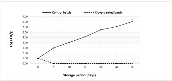 At the end of the study, an in situ application study was conducted to evaluate the preservation efficiency of the extract. The results of microbiological quality were displayed in (Figure 2). During the shelf-life period of refrigerated bio-labneh, the most common concern, the mold and yeast populations, were enumerated and the count was recorded as Log CFU/g. Prior to storage (zero time), both the control sample and the spray-treated sample recorded 1 Log CFU/g. As time passed, the control sample showed an increase in fungal count, reaching 8.04 Log CFU/g at 56 days of cold storage. In contrast, no growth was revealed in the spray-treated sample after 5 days until the end of the 56 days in the refrigerator, achieving significant reduction in fungal count than the control under the same conditions (p < 0.05). Similar data were observed by [39] who detected no growth of mold and yeast in labneh containing essential oils throughout a storage period of 21 days. El-Awady et al. [40] showed a significant (p < 0.05) effect on mold and yeast counts in yogurt fortified with clove extract nano-formulations at ratios of 0.0125, 0.025, and 0.05% in up to 15 days of cold storage. On the other hand, Rifky et al. [41] studied the effects of various essential oils (EOs) such as cinnamon, garlic, caraway, and clove oils on yogurt production. They found that mold and coliform counts were not detected in any treatments for up to 30 days of storage, while garlic extract had the highest impact after 40 days of cold storage.