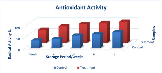 Antioxidant activity (%) of bio-labneh when fresh and during storage period/weeks.