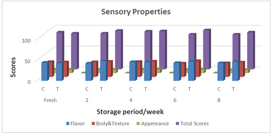 The critical method for determining the quality and shelf life of any product is examining its sensory characteristics. Control and spray-treated samples had been evaluated for sensory parameters, as presented in (Figure 4). There were no significant (p ≤ 0.05) differences between the two samples at the fresh time in all parameters. By that time, the significant (p ≤ 0.05) differences clearly appeared between the control and treated samples. All spray-treated samples gained the highest scores in flavor, appearance, body, and texture during the storage period compared to the control ones. The best scores were at 2, 4, and 6 weeks, they then started to slightly decrease at the end. The sprayed extract gave the product a refreshing taste even with its small amount.