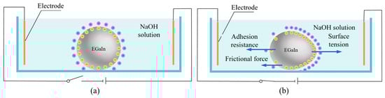 Movement mechanism of liquid metal under an electric field: (a) Electric double-layer stabilized liquid metal particles; (b) Liquid metal particles under the action of an electric field.