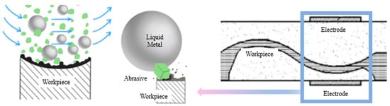 The abrasive particles are impacted toward the surface of the workpiece by collision with the liquid metal, as shown in Figure 3 [].