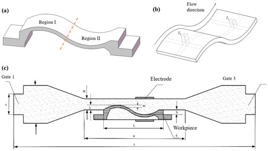 Under the multifield coupling, the collision process between liquid metal droplets and abrasive particles inside the flow channel exhibits highly nonlinear characteristics []. To study the motion behavior of metal droplets and abrasive particles, as well as the collision-based material removal mechanism in the multifield coupling, a liquid metal–abrasive particle flow coupled processing model under the influence of an applied electric field has been established, as shown in Figure 4. The workpiece to be processed is a titanium alloy with a complex curvature, as depicted in Figure 4a. The flow direction on the surface of the titanium alloy workpiece is shown in Figure 4b. In the overall processing model, the flow channel structure is designed to resemble a Venturi tube, as shown in Figure 4c. The geometric parameters of the overall processing model are listed in Table 1. In the processing device, the metal droplets and abrasive particles enter from the left side along with the base solution, pass through the tapered acceleration region, and then enter the processing area. In the processing area, the electric field drives the liquid metal droplets to collide with the abrasive particles. After the collision with the metal droplets, the abrasive grains undergo a collision and material removal process with the workpiece and finally leave the machining area from the right-hand flow channel. The distribution law of metal droplets and abrasive particles in the flow field of the base liquid and the collision behavior under the action of the electric field are investigated based on the above model.