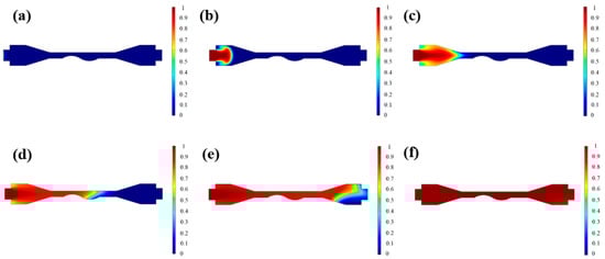 The abrasive flow process. (a) t = 0 s; (b) t = 0.01 s; (c) t = 0.02 s; (d) t = 0.03 s; (e) t = 0.05 s; (f) t = 0.13 s.