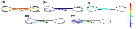 The externally applied electric field in this paper is an AC electric field with voltages of 6 V, 12 V, 24 V, and 36 V. The alternating electric field, as a vector field, directly affects the motion trajectory of liquid metal particles. Since the alternating electric field is constantly changing, the motion trajectory of the liquid metal is influenced not only by the amplitude of the alternating electric field but also by the instantaneous electric field when the liquid metal enters the field. In this study, the COMSOL Multiphysics 5.4 software fluid flow particle tracking interface, combined with the multiphase fluid model and alternating electric field model, is used to obtain the motion trajectories of liquid metal particles entering from the inlet 1 under different alternating voltages, as shown in Figure 8. In the absence of an applied electric field, the metal droplets follow the flow field distribution through the processing area and exit the processing zone from the right side of the model. As the voltage increases to 6 V, only a portion of the metal droplets’ motion trajectories do not come into contact with the workpiece and leave the flow field directly, which indicates that the participation rate of these metal droplets in the processing is low at this point. It is observed that as the voltage increases, the motion trajectories of the droplets show more intense collisions with the workpiece, with all the metal droplet trajectories intersecting with the surface of the workpiece. It suggests the increased participation rate of the metal droplets in the processing, which accelerates the material removal rate. The above results show that the applied AC electric field promotes the contact between the particles and the surface to be processed and improves the processing efficiency.