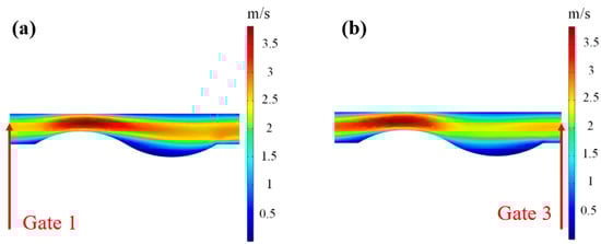 Flow field velocity distribution. (a) Gate 1 is the entrance; (b) gate 3 is the entrance.
