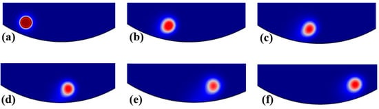 Motion diagram of liquid metal particles in liquid phase. (a) moment 1; (b) moment 2; (c) moment 3; (d) moment 4; (e) moment 5; (f) moment 6.