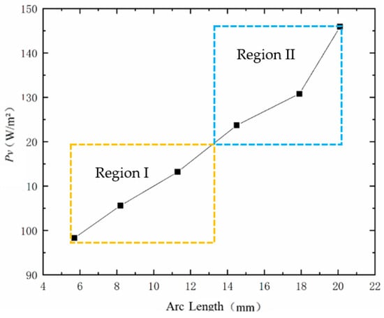 In Region II, liquid metal droplets traverse from position a to position f in the sequence a-b-c-d-e-f, influenced by the combined effects of the flow field and electric field. During this motion, the droplets collide with surrounding abrasives, consequently affecting the Pv variation in the near-wall region of the workpiece. Figure 11 illustrates this Pv variation. As the liquid metal droplets travel along the sequence, they collide with the abrasives. These collisions are crucial because they transfer kinetic energy to the abrasives, affecting the overall dynamics of the material removal process. The impact of the droplets on the abrasives can lead to changes in the local Pv, particularly in the near-wall region of the workpiece. The trend of the Pv value during the movement of abrasive grains in the machining area is shown in Figure 11. The near-wall region is where the material removal is most concentrated, and any changes in the Pv in this area can directly influence the efficiency and quality of the polishing or machining process.