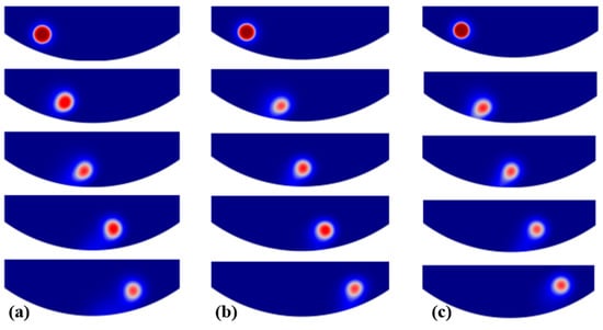 Motion diagram of liquid metal at different voltages. (a) 12 V; (b) 24 V; (c) 36 V.