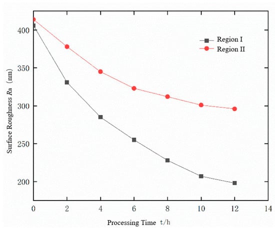 Following the 12 h processing period, notable differences in roughness changes are observed between regions I and II. The roughness value in Region I decreases more significantly than in Region II, resulting in a roughness difference of 102 nm between the two regions. Examining the trend over various time intervals reveals that the roughness decreases rapidly at the beginning of the process. Subsequently, as surface quality improves, the abrasive effect of the particles tends to saturate, leading to a slower decrease in roughness. A comparison of the descending trends indicates that the roughness in Region I decreases more rapidly than in Region II, suggesting that abrasive particles are more active in Region I. This observation aligns with the simulated results of surface Pv values obtained in the previous analysis.