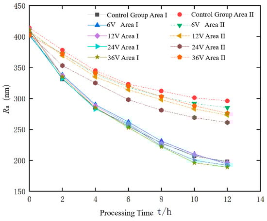 The experimental group comprises four identical titanium alloy specimens, each subjected to a different amplitude of alternating current (AC) voltage. A Mitutoyo surface roughness tester is employed to measure the surface roughness values in regions I and II. The initial surface roughness for regions I and II is 406 nm and 414 nm, respectively (averaged over four points per region). The surface roughness of different areas of the workpieces in the four experimental groups is shown in Table 4. Figure 18 presents the surface roughness values of the remaining specimens after 12 h of processing.