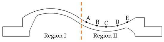 The machining area is divided into two distinct zones: Zone I; The convex region, characterized by a narrower channel and higher overall fluid velocity, resulting in greater kinetic energy of abrasives. This is defined as the strong flow field region. Zone II; The concave region, defined as the weak flow field region due to its wider channel and, consequently, lower fluid velocity. Within these zones, specific areas are identified: Gate 1, The area near the entrance of Zone I. Gate 3, The area near the entrance of Zone II. This zonal classification allows for a more nuanced analysis of the material removal process, taking into account the varying flow characteristics in different regions of the workpiece surface, as shown in Figure 9.