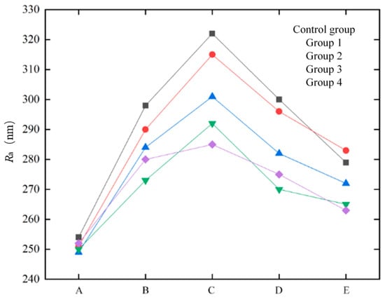 The graphical data clearly demonstrate that in Region II, the application of an AC electric field, driven by the liquid metal, enhances the abrasive action, resulting in a reduction in surface roughness. Experimental Group 3 exhibits the most significant reduction in roughness; when a 24 V voltage is applied, the average surface roughness in Region II decreases from 404 nm to 261 nm, representing a reduction of 143 nm.