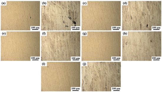 Surface morphology of each region in different experimental groups: (a) region Ⅰ under 0 V; (b) region II under 0 V; (c) region Ⅰ under 6 V; (d) region II under 6 V; (e) region Ⅰ under 12 V; (f) region II under 12 V; (g) region Ⅰ under 24 V; (h) region II under 24 V; (i) region Ⅰ under 36 V; (j) region II under 36 V.