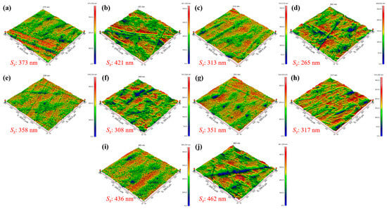 A comparative analysis of the morphologies in the two regions reveals distinct surface characteristics. The surface in Region I exhibits a smoother texture with fewer and shallower scratches, although small pits are present due to the impact of abrasive particles. In contrast, Region II displays an inferior cutting performance of abrasive particles compared to Region I, resulting in deeper scratches and larger pits. However, with increasing voltage, the morphology of Region II shows notable improvement. As illustrated in Figure 24f, this region demonstrates reduced scratch depth and a smoother surface compared to other experimental groups. In the experimental group, due to the action of liquid metal, the surface roughness value of area II is reduced, and the roughness value of area I is basically unaffected due to the weak influence of the electric field and the roughness difference between the two areas is reduced, in which 24 V has the best effect, with a roughness difference of 58 nm, which verifies that the liquid metal-abrasive flow improves the homogeneity of the surface polishing of the abrasive flow surface.