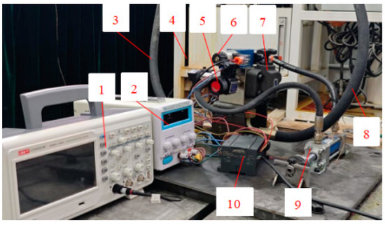 Test bench for pushing and pulling strength tests on the piston-returning spherical joint pair. 1—oscilloscope; 2—DC power supply; 3—oil outlet pipeline; 4—pressure sensor; 5—pressure relay; 6—three-position four-way electromagnetic directional valve; 7—throttle valve; 8—oil inlet pipeline; 9—pushing and pulling device of the piston-returning spherical joint pair; 10—PLC.