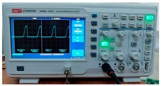 The data monitoring mainly relies on the pressure sensors in the pipelines to achieve the function of real-time pressure monitoring in the hydraulic cylinder. Connect the signal line of the pressure sensor to the signal input terminal of the oscilloscope. After the electronic signal output by the pressure sensor enters the signal input terminal of the oscilloscope, the pressure change trends and patterns in the hydraulic cylinder can be detected in real time using an oscilloscope, as shown in Figure 5. The data stored in the oscilloscope can be transferred to the computer via a USB flash drive. In Figure 5, the display screen of the oscilloscope shows Chinese. The right column of the display screen is the storage column. From top to bottom, they are storage type, reference waveform, signal source, save, and export options. The lower side of the display screen shows the graphic numerical display. From left to right, they are maximum value, minimum value, frequency, and average value.