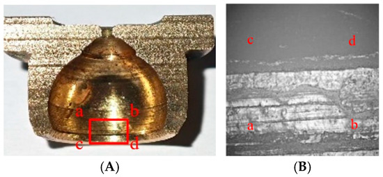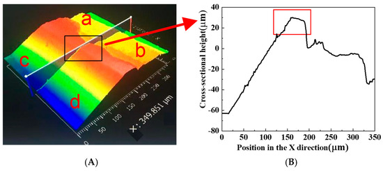 The change in the axial clearance can be obtained by measuring the total length of the piston–slipper kit with a micrometer, before and after the test. In this study, we mainly analyzed the wear deformation at the spherical socket closure of the slipper. After the test, the slipper was wire-cut. The slipper section is shown in Figure 6A. White light interference topography is used to observe the spherical socket closure of the slipper (the abcd frame selection position shown in Figure 6), with its surface topography shown in Figure 6B. After the test, it was found that there were obvious wear marks at the contact position between the piston ball head and the spherical socket closure of the slipper. The wear marks had a ring shape, mainly appearing at the connection between the piston ball head and the spherical socket closure.