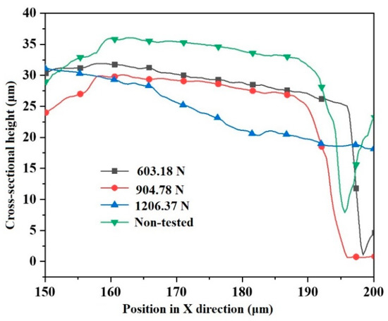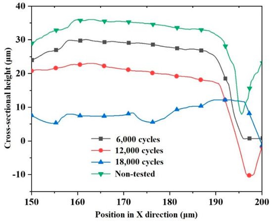 The pressure relay on the side of the rod cavity of the hydraulic cylinder was adjusted to 1.5 MPa; that is, the pulling force of the piston rod of the hydraulic cylinder was 904.78 N. In order to test the influence of the number of pushing and pulling cycles on the deformation of the spherical socket closure of the slipper, the number of cycles was set to 6000, 12,000, and 18,000 times. The cross-sectional shape curves of the spherical socket closure at three different pushing and pulling times were obtained, as shown in Figure 9.