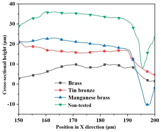 It can be seen from Figure 10 that the maximum decrease in the raised part of the spherical socket closure section machined with manganese brass is 14.83 μm, compared to the case of no pushing and pulling tests. There is a depression in the middle of the cross-sectional shape curves of the closure of the tin bronze slipper, indicating that the deformation of the middle area of the closure is large; the maximum deformation is 19.38 μm. The cross-sectional shape curve of the spherical socket closure is different when the slipper material is ordinary brass, and the overall decrease in the raised part is larger, with the maximum deformation being 26.6 μm. It is clear that there are several minor abrasion marks along the axial direction of the spherical socket closure surface, indicating that the wear of the ordinary brass is more severe.