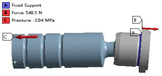 When the piston enters the oil discharge area, the bottom of the piston bears the oil discharge pressure; that is, the pressure applied at the bottom of the piston is 21 MPa; accordingly, a fixed support constraint should be applied on the bottom surface of the slipper [23,24]. It is known from flow field simulation analysis that at the moment when the piston enters the oil suction area from the oil discharge area, the maximum negative pressure generated inside the piston cavity is 3.04 MPa, so a vertical downward force is added to the bottom surface of the slipper. There is also a returning force exerted on the contact surface of the slipper and the returning plate, and this value is 540.5 N, obtained by calculations. The force model of the spherical socket pair is established when the piston enters the oil suction area, as shown in Figure 11.