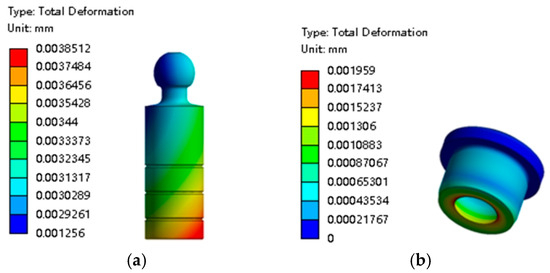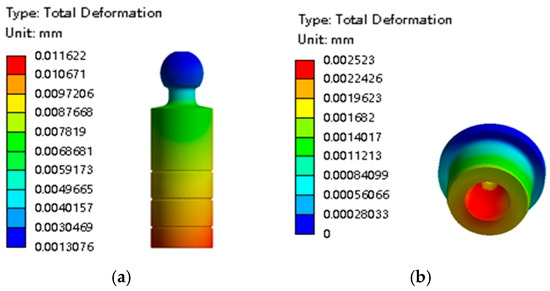 When the piston enters the oil discharge area from the oil suction area, the contact simulation of the piston–slipper kit is carried out to obtain the deformation and stress distribution of the piston and slipper, as shown in Figure 12 and Figure 13, respectively.