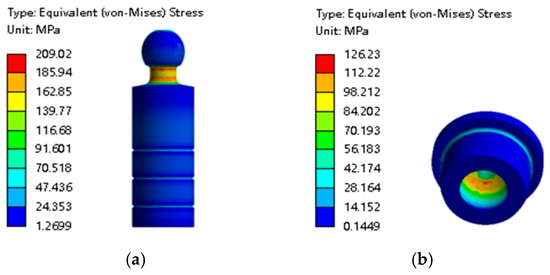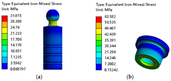According to Figure 15a, the maximum stress of the piston is concentrated in the neck of the piston, and stress is also concentrated at the lower surface of the ball head. We can observe in Figure 15b that the maximum stress of the slipper is 63.582 MPa, which is less than the yield strength of the slipper material; furthermore, the maximum stress is located at the spherical socket closure of the slipper.