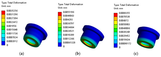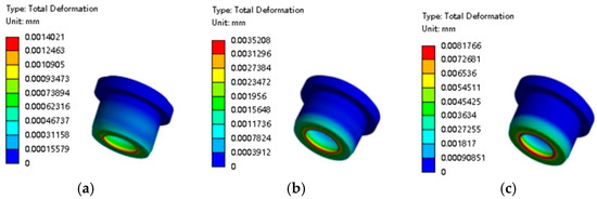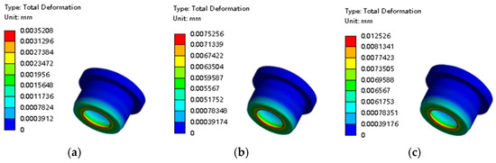 Manganese brass, tin bronze, and ordinary brass were selected as the slipper materials, and the deformation at the spherical socket closure of the slipper was compared for these three cases. We set the periodic pulling force at 904.78 N and the number of pushing and pulling cycles at 12,000. The deformation distributions of the slippers with different materials were obtained, as shown in Figure 18.