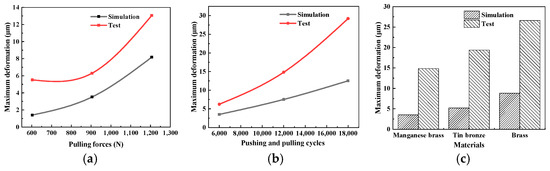 We aggregated the simulation and test results for slipper deformation under various factors, and the maximum deformation curve of the slipper with respect to pushing and pulling forces and the pushing and pulling cycle was obtained, as shown in Figure 17a,b. The simulation and test results of the maximum deformation of the slippers with different materials are presented in Figure 17c.