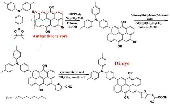 The synthesis procedure of D2, as adopted from ref. [15]. The designed dyes, D5 to D11, can be synthesized by replacing the anthanthrene core with naphthalene, anthracene, phenanthrene, pyrene, naphthacene, chrysene, and perylene cores, respectively.