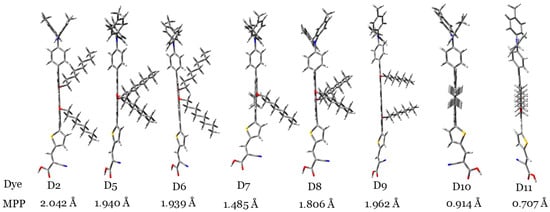 To illustrate the degree of planarity of dye molecules, Figure 2 shows the dye molecules vertically. By looking at the orientations of the two alkyl groups in this figure, we can judge planarity. Figure 3 indicates that the D10 and D11 dye molecules showed more planarity compared to those of other dyes, since, in these two dyes, the two alkyl groups are coplanar with the aromatic cores. Also, to confirm this result, the molecular planarity parameter (MPP) was calculated [38]. MPP estimates the deviation of the whole molecular structure from the plane. Lower MPP values signify larger planarity. It is calculated utilizing the Multiwfn software (version 3.8) [39]. Accordingly, the planarity of the investigated dyes can be ordered as follows: D11 > D10 > D7 > D8 > D6 > D5 > D9 > D2.