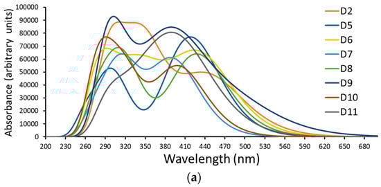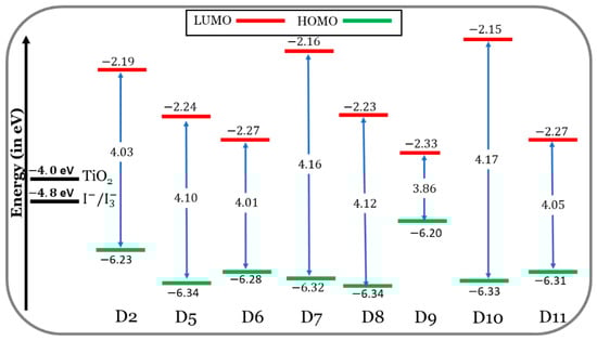 The energy gap is defined as follows: . It is expected that lower energy gaps will favor ICT within the dye molecule’s skeleton and redshift, its absorption maxima. The values of decrease in the following order: D10 (4.17 eV) > D7 (4.16 eV) > D8 (4.12 eV) > D5 (4.10 eV) > D11 (4.05 eV) > D2 (4.03 eV) > D6 (4.01 eV) > D9 (3.86 eV). Only the D6 and D9 dyes (especially D9) show smaller energy gaps than the D2 dye, which means easier electron excitation and longer absorption wavelengths. This is evident in Section 3.1.3.