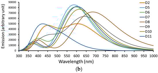 A simulation of the (a) absorption spectrum and (b) emission spectrum of dyes D2 and D5 to D11.