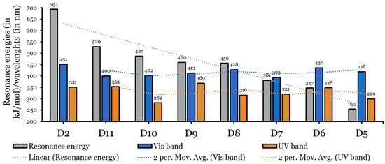 As with the D2 dye, the absorption spectra of dyes D5 to D11 also consist of two main bands. One ranges from 281.66 nm to 368.70 nm (UV region), and there is another band in the Vis region (in the range of 393.40 nm to 436.19 nm) (see Figure 5 and Table 2). Opposite to the oscillation strength values obtained for the four experimentally tested dyes in [15], here (the seven designed dyes), the values of the Vis bands are larger than those of the UV region; therefore, the Vis bands are more intense than the UV bands. Because most solar light belongs to the visible and near-infrared ranges, this result is more beneficial [43]. As a general note, the values of the designed dyes become redder and shifted (longer wavelengths) as the resonance energies of the aromatic rings increase. This has also been proven in the literature [17,44]. This conclusion is shown in Figure 6.