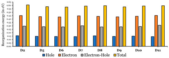 Additionally, the designed dyes showed better optimal electron–hole transport and smaller values. For D2, eV, while the values for the designed dyes are in the range of 0.286 eV to 0.291 eV. The exceptions are D7 ( eV) and D11 ( eV). Also, the total reorganization energy ( + ) values were calculated (see Figure 7 and Table S1). The values of the dyes become smaller as the separation between the electron and hole becomes more effective. Due to this, recombination processes are rendered [45], and all the designed dyes have smaller values compared to that of the D2 dye.