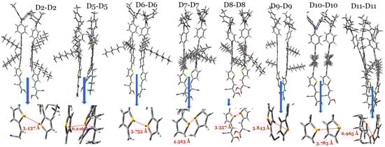 The optimized π-stacking arrangement of two adjacent dye molecules of the investigated dyes calculated at the CPCM/M06-2x/6-31+G(d,p) in THF. Note: the arrow between the two sulfur atoms (yellow) of the thiophene units is considered to represent the space distance between two interacting dye molecules.