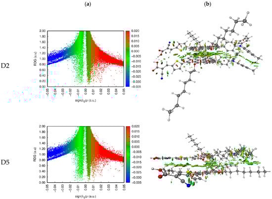 NCI isosurfaces: (a) 2D scatter maps and (b) 3D color-filled RDG isosurfaces of D2 and D5 dye dimers as representative examples at CPCM/M06-2x/6-31+G(d,p) in THF.