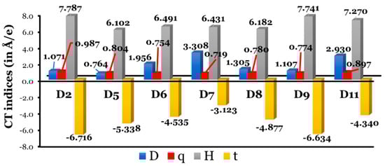 For all investigated dyes, an overlap between the centroids along the axis of charge transfer is expected, since the index is . Finally, the index (quantify through-space excitations in ICTs) should satisfy three important criteria: (i) it should be smaller than 1.6 to accurately account for the transition energy [54,55,56]; (ii) it should be positive, since positive values of are associated with a better separation between the areas of density increment and depletion, and (iii) an increase in the value occurs with a reduced overlap between electron-donating and electron-accepting regions [57]. The recorded values are all less than 1.6 and are negative, evidencing regions of high and low electron density overlap spatially [54,57]. The extent of overlap increases as the values become more negative, and this follows the following order: D7 (−3.123 Å) > D11 (−4.340 Å) > D6 (−4.535 Å) > D8 (−4.877 Å) > D5 (−5.338 Å) > D9 (−6.634 Å) > D2 (−6.716 Å). In D2 (with the largest ), a region of high and low electron density overlaps the most, while all the designed dyes have a smaller overlap.