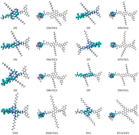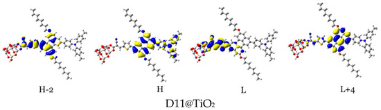 Figure S4 represents the total density-of-states (TDOS) plots of the dye@TiO2-adsorbed systems. We did not consider the partial DOS (PDOS) from each component in the dye@TiO2 systems, i.e., dye and TiO2, because the PDOS of a dye is expected to have a minor contribution to the TDOS [72,73]. The energy gaps () of dye@TiO2 fall in a small region and decrease in the following order: D10@ TiO2 (4.053 eV) > D7@ TiO2 (4.000 eV) D8@ TiO2 (3.990 eV) > D5@ TiO2 (3.984 eV) > D11@ TiO2 (3.945 eV) > D6@ TiO2 (3.905 eV) > D2@TiO2 (3.883 eV) > D9@TiO2 (3.782 eV). This order indicates the order of increasing ICT properties of the dye@TiO2 systems with respect to each other.