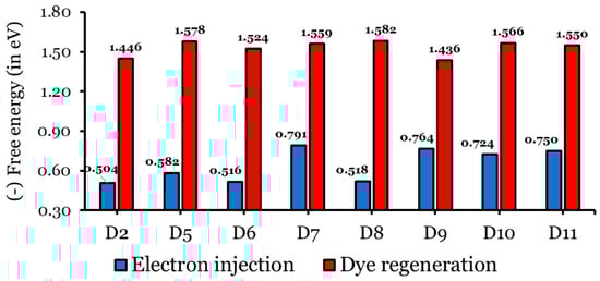Charge injection into the CB, followed by dye regeneration, is highly dependent on the difference between a dye’s excited state oxidation potential (ESOP = ) and TiO2’s CB, and the optimal value of the free energy of electron injection is eV [37,58,59]. Meanwhile, the optimal difference between a dye’s ground-state oxidation potential (GSOP = ) and an electrolyte’s redox couple, the free energy of a dye regeneration, is eV [37,58,59]. The values of the , , , , and of the eight investigated dyes calculated in THF at CPCM/TDCAM-B3LYP/6-31G(d,p) are listed in Table S3, and the values of and are represented graphically in Figure 12. The values of the investigated dyes range from to eV eV, as required), and the values range from to eV ( eV, as required). Negative values of indicate that a dye has sufficient driving force to ensure electron injection into TiO2. According to Figure 11 and Table S3, all the designed dyes have greater values than that of the D2 dye molecule, implying that the designed dyes have a considerably increased electron injection driving force [30,48,60,61]. The values increase (become more negative) as follows: D2 ( eV) < D6 ( eV) < D8 ( eV) < D5 ( eV) < D10 ( eV) < D11 ( eV) < D9 ( eV) < D7 ( eV).
