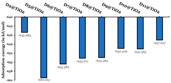 It is safe to assume that stable adsorption occurs when the adsorption energy is negative, see Table S4, and the data in Table S4 is illustrated graphically in Figure 13. Table S5 lists the bond lengths of the two Ti–O bonds between the dye and TiO2 cluster. Table S5 shows that the bond lengths of these two bonds in the eight investigated dyes are very comparable and are approximately equal to 2 Å. They are in the range of 2.0377 to 2.0652 Å. The obtained bond lengths are in the same range reported in other theoretical works for other dye@TiO2-adsorbed systems [37,45,68]. Hence, a chemosorption type of adsorption may occur in these adsorbed systems [45], and this conclusion is supported by the reported values of adsorption energies, as we will see in the next paragraph.